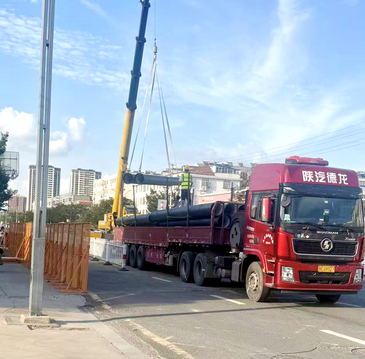 近日,我县加大基础设施改造,对不适合城市发展的地下管道及时整改,助推“不淹不涝”城市提质增效。图为施工队在卸污水管道。